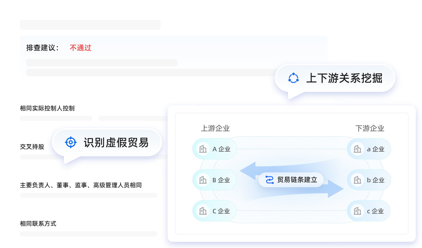 排查合作伙伴之间的交叉持股、控制关系、相同人员以及相同经营地址、联系方式等关联关系,识别潜在虚假贸易的可能性