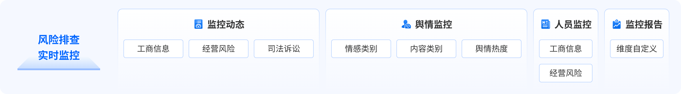 高效整合企业的多维度公开信息,智能化追踪监控舆情及商业动态变化,支持多方订阅功能实现预警信号分发,帮助金融机构用户精准高效完成准入核查和风险监控工作